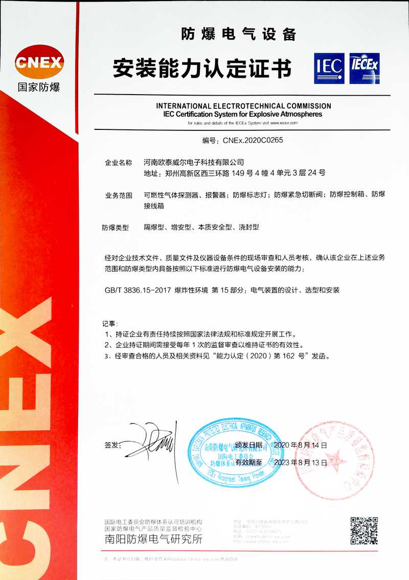 歐泰威爾作為國(guó)內(nèi)較知名的物聯(lián)網(wǎng)氣體探測(cè)儀器制造商,公司高度重視與國(guó)內(nèi)外大專院校的技術(shù)創(chuàng)新與學(xué)術(shù)成果交流,擁有專業(yè)氣體探測(cè)研發(fā)機(jī)構(gòu),專業(yè)質(zhì)檢生產(chǎn)工藝及相關(guān)檢測(cè)設(shè)備,技術(shù)力量雄厚,并不斷致力于產(chǎn)品品質(zhì)提升,公司及產(chǎn)品先后取得國(guó)家防爆電氣產(chǎn)品合格證、國(guó)家防爆電氣安裝、修理、維護(hù)資格證,國(guó)家應(yīng)急管理部消防產(chǎn)品CCCF認(rèn)證,國(guó)家計(jì)量器具形式批準(zhǔn)證書等并在國(guó)家權(quán)威部門形式注冊(cè)。